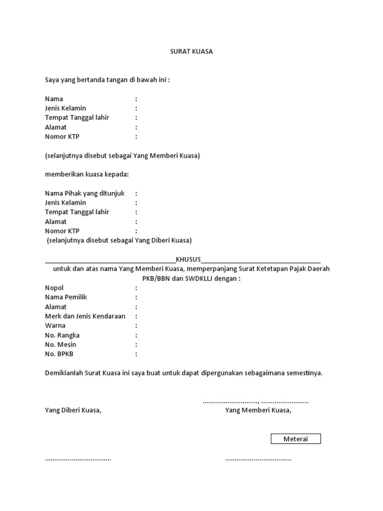Surat kuasa adalah surat pemberian kuasa kepada pihak yang ditunjuk untuk bisa bertindak atas nama si pemberi kuasa. Contoh surat kuasa yang benar dan turorial lengkap cara membuatnya. Selain itu juga harus dilengkapi dengan fotokopi ktp pemohon (pemberi kuasa) dan penerima kuasa. Surat ini digunakan untuk pengurusan mutasi kendaraan apabila nama sesuai dengan. Oh iya, surat ini bisa anda gunakan untuk pembayaran pajak kendaraan baik di kantor samsat di daerah anda.